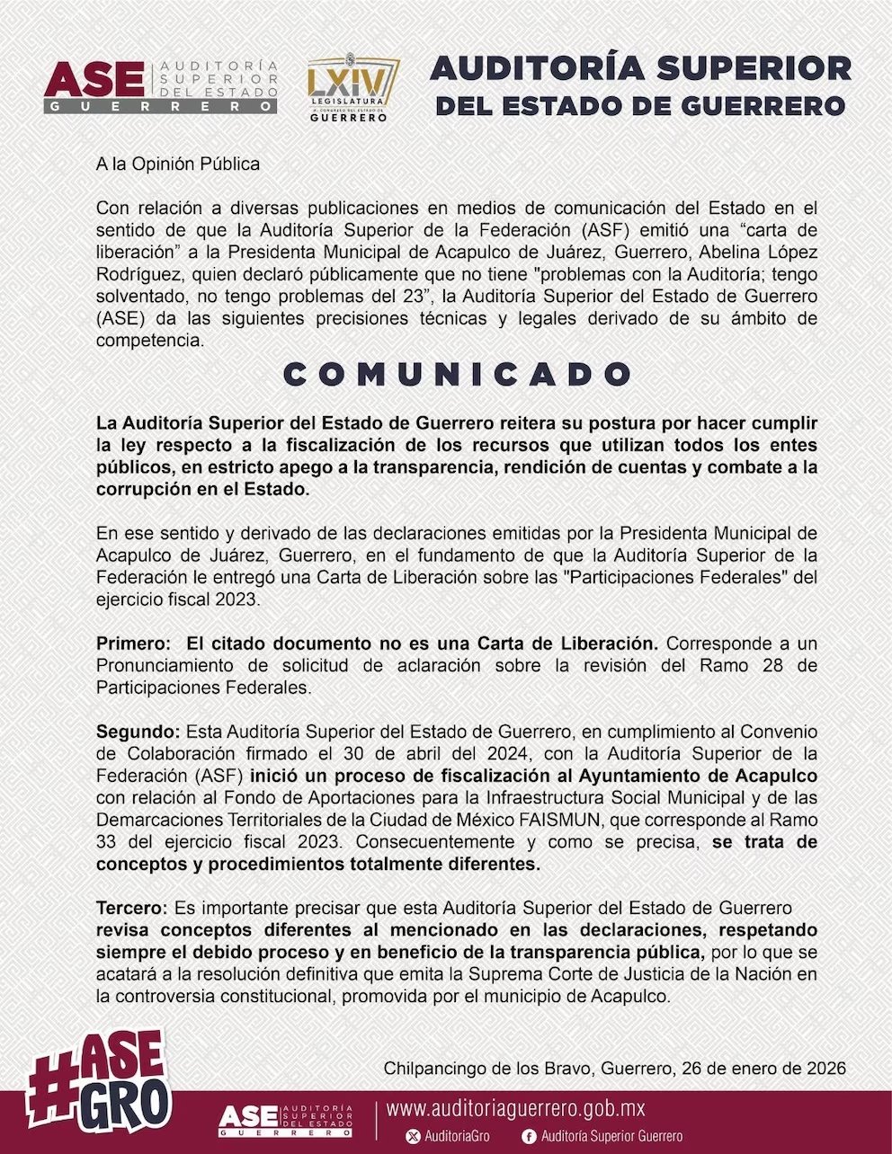 Finalmente, la ASE informó que respetará el debido proceso y acatará la resolución que emita la Suprema Corte de Justicia de la Nación, en el marco de la controversia constitucional promovida por el municipio de Acapulco, dejando en claro que no existe exoneración alguna y que la auditoría permanece abierta.