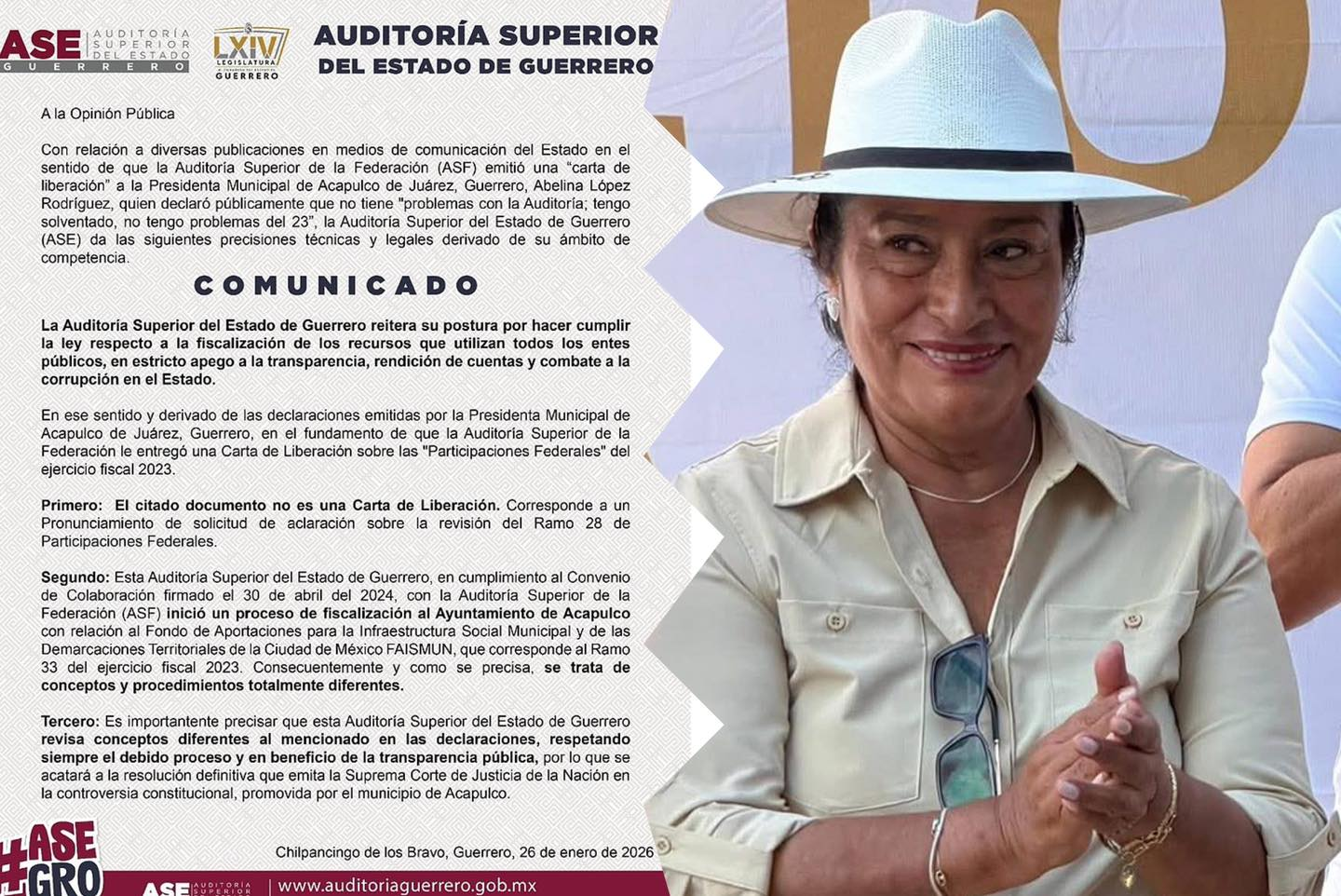 La Auditoría Superior del Estado de Guerrero (ASE) aclaró que la alcaldesa de Acapulco, Abelina López Rodríguez, no cuenta con una “carta de liberación” ni ha concluido sin observaciones la revisión de la cuenta pública correspondiente al ejercicio fiscal 2023.