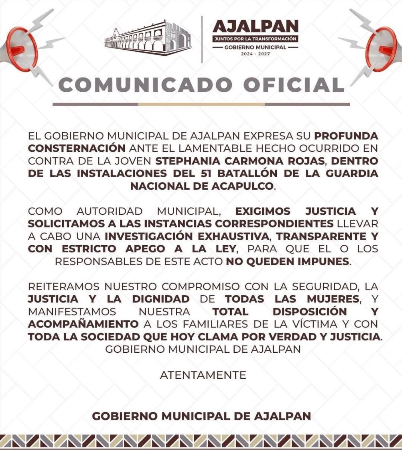 De acuerdo con los primeros reportes, la víctima estaba adscrita al sector Caminos de la Guardia Nacional. Fue identificada como Dalila N, de 23 años de edad.